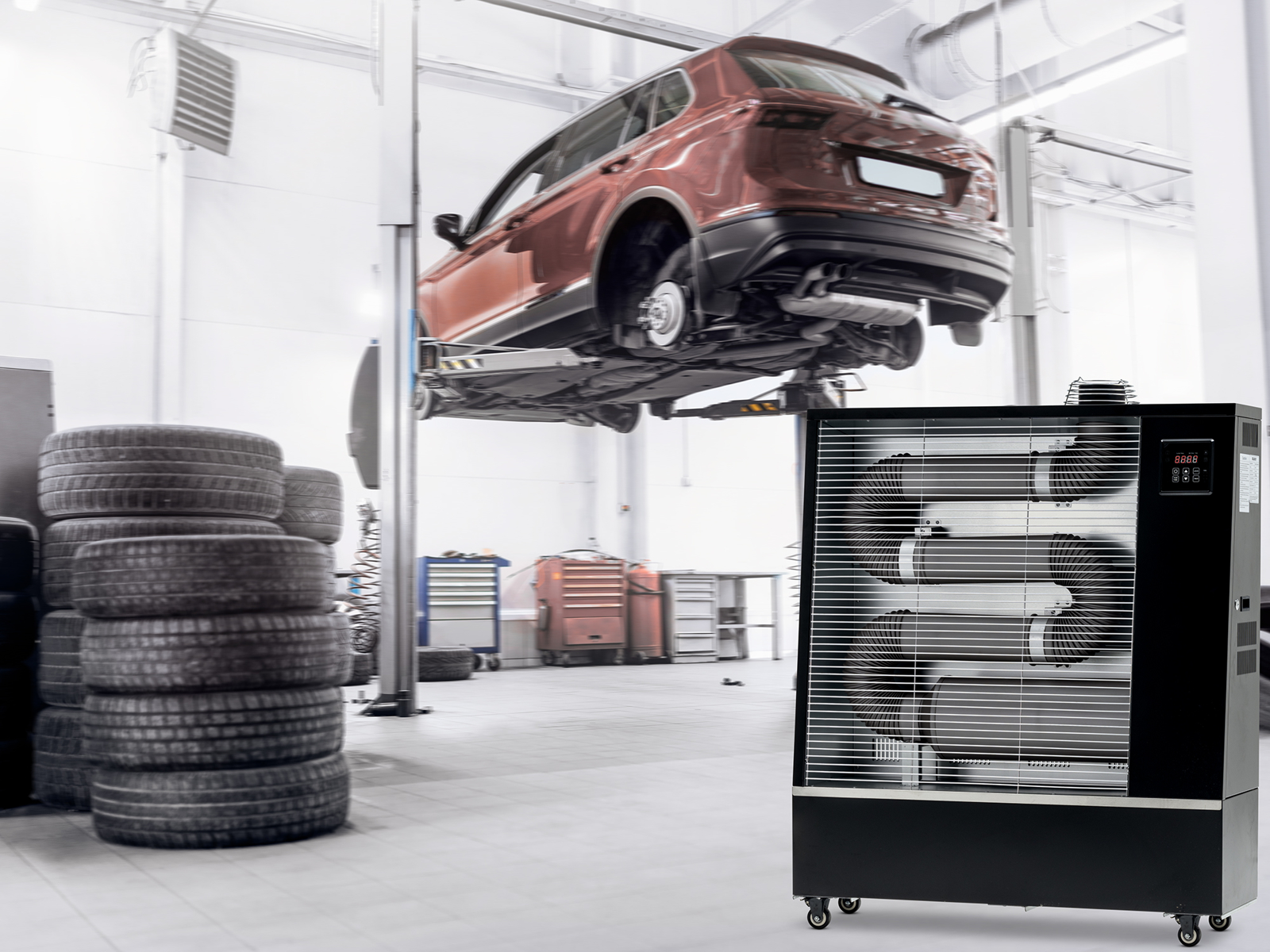 Innovatives Heizsystem für belüftete, geschlossene Räume ( Werkstätten, Gewerbe, Industrie, Landwirtschaft, Lager, Turnhallen) und Außenbereiche wie Gewächshäuser, Terrassen, Baustellen, etc.