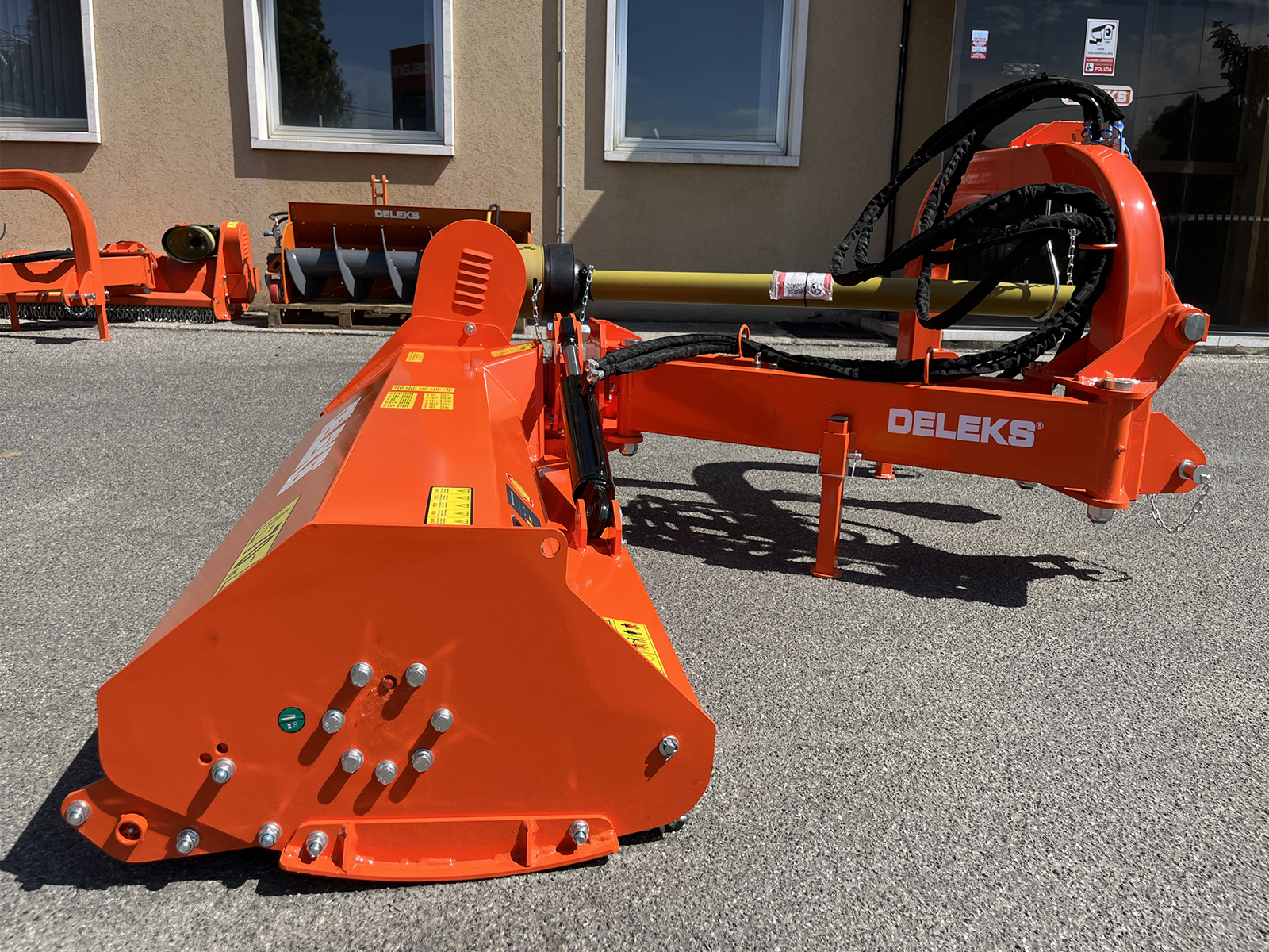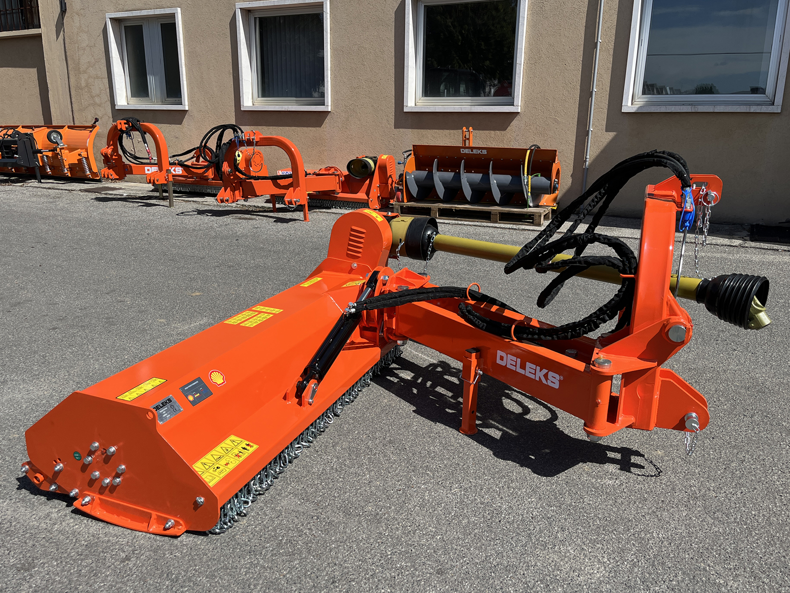 Über die Spur hinaus und in geneigter Arbeitsstellung s säubert der Deleks Böschungsmulcher Straßenränder und Gräben, bei Vertikaler Arbeitsstellung hingegen stutzt er Hecken und Böschungen. Durch das in der Mitte des Gerätes verbaute Getriebe kann der Mulcher auch mittig hinter dem Schlepper gefahren werden, damit eignet er sich auch Bestens zur Ausführung von Arbeiten in schmalen Reihenabständen.