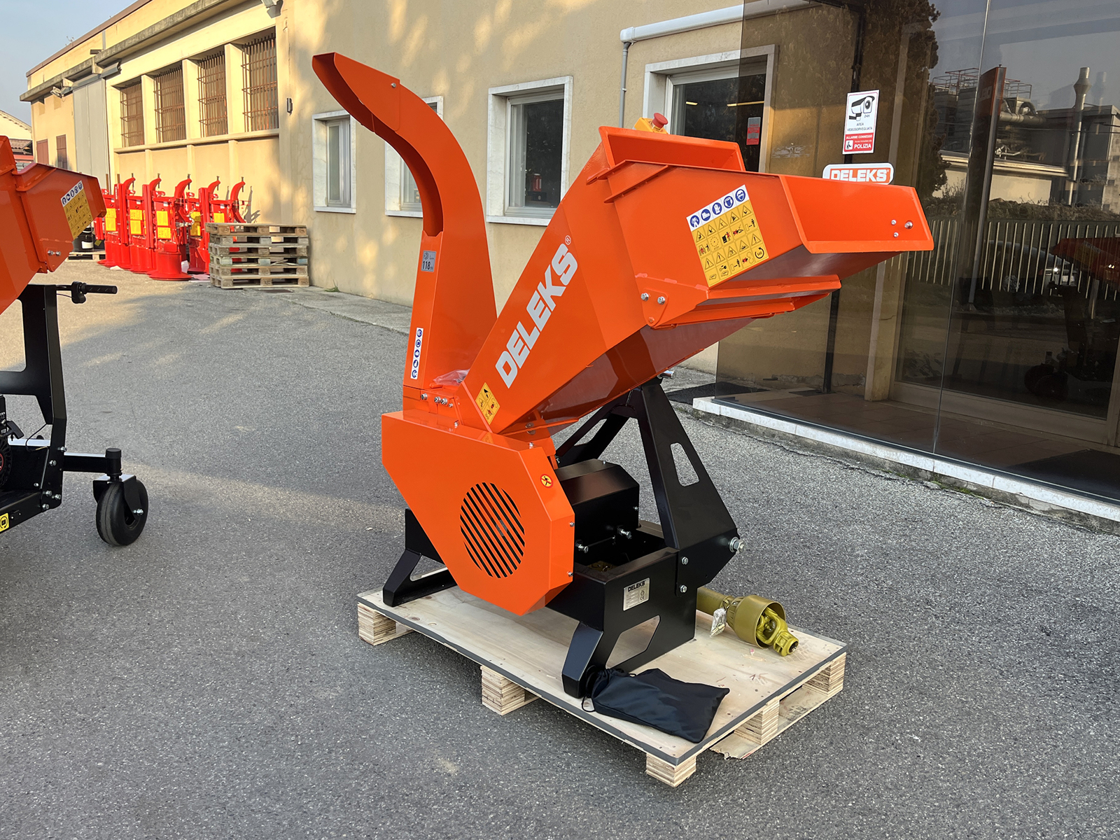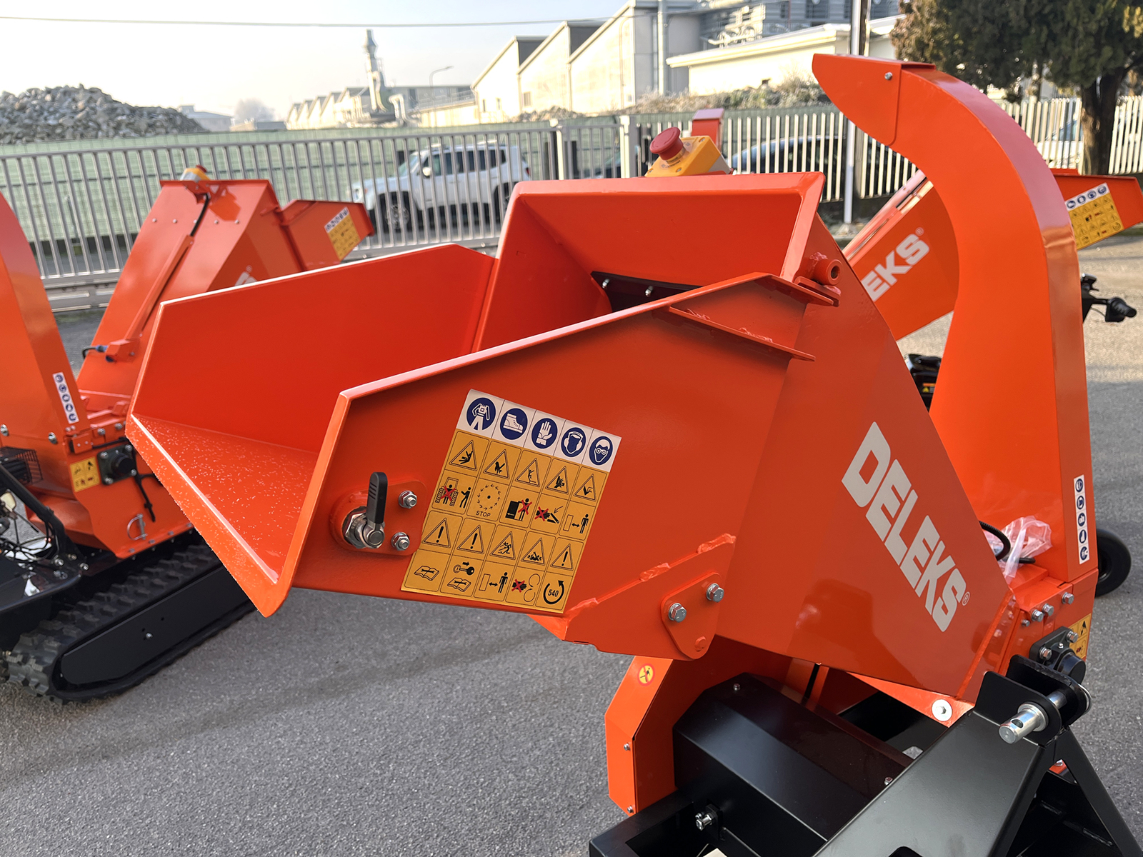 Die Maschine ist mit einem Not-Aus-Schalter in Pilzform ausgestattet, der an den Traktor angeschlossen werden kann und eine sofortige Abschaltung des Schneidsystems im Notfall ermöglicht. Mechanische Schutzvorrichtungen und Sicherheitssysteme gewährleisten den Betrieb gemäß den geltenden Vorschriften.