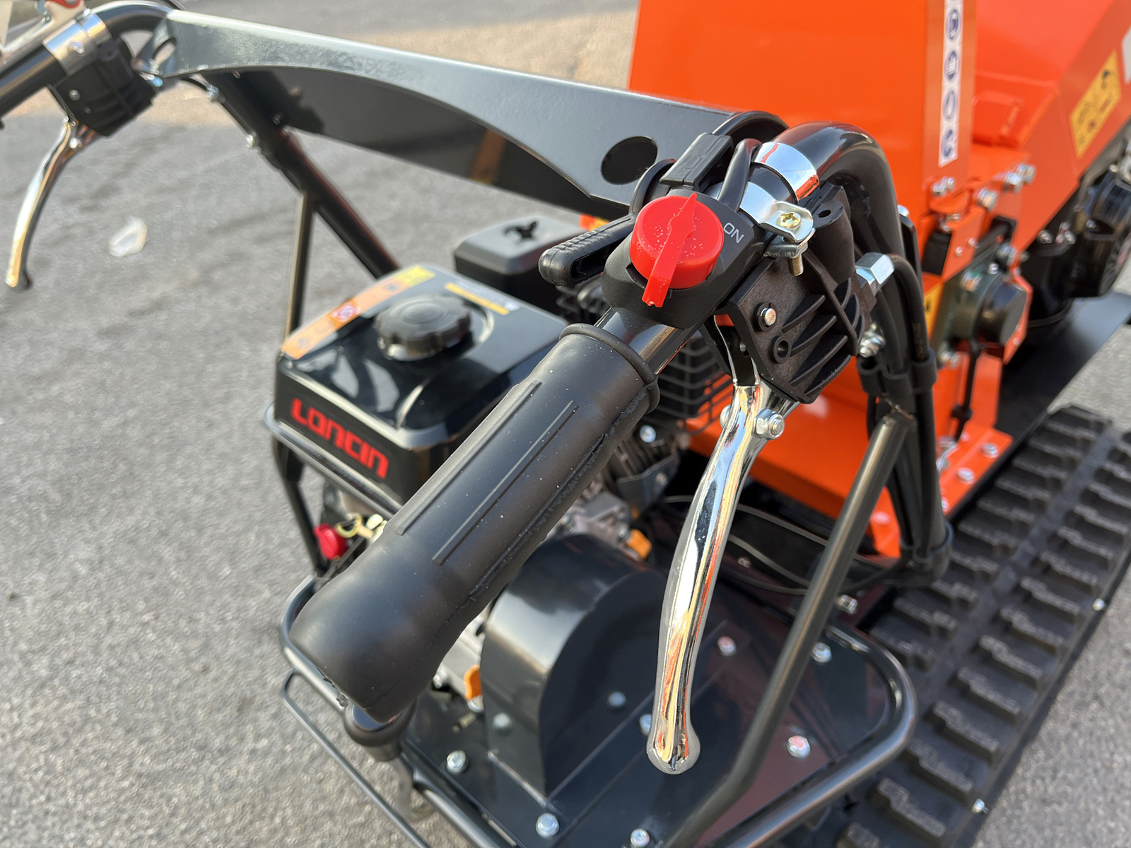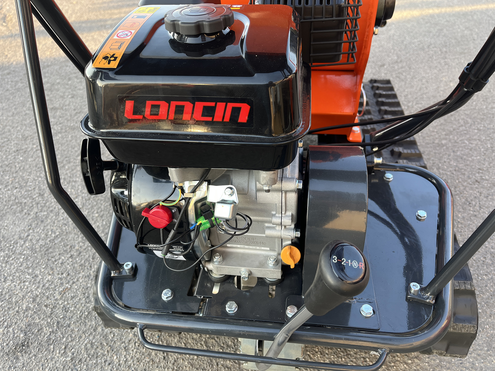 Die Fortbewegung erfolgt über ein Kettenfahrwerk, das von einem Loncin-Motor mit 196 cm³ angetrieben wird. Das mechanische Getriebe verfügt über 3 Vorwärtsgänge und 1 Rückwärtsgang, sodass die Geschwindigkeit an Gelände und Arbeitsbedingungen angepasst werden kann.