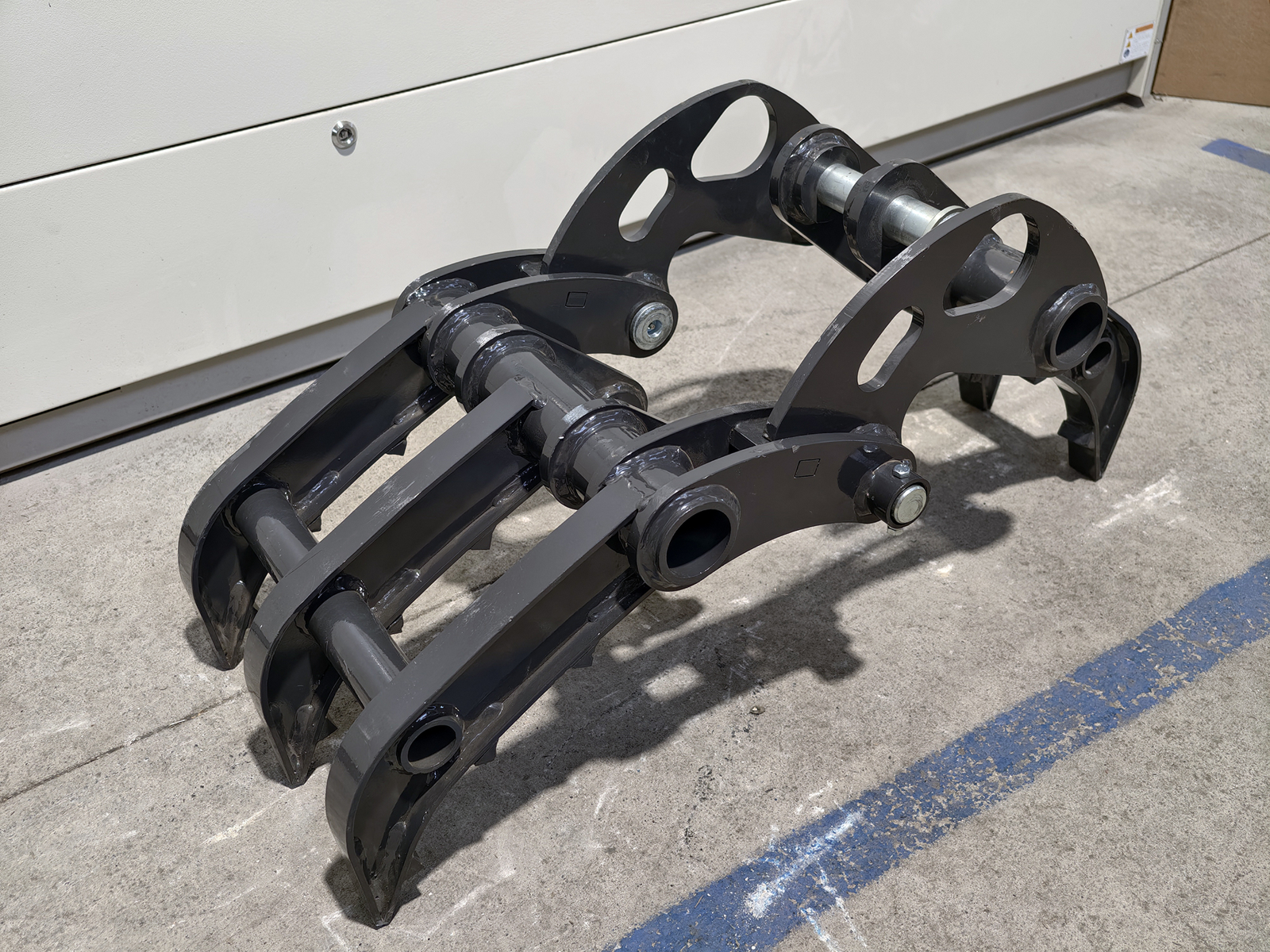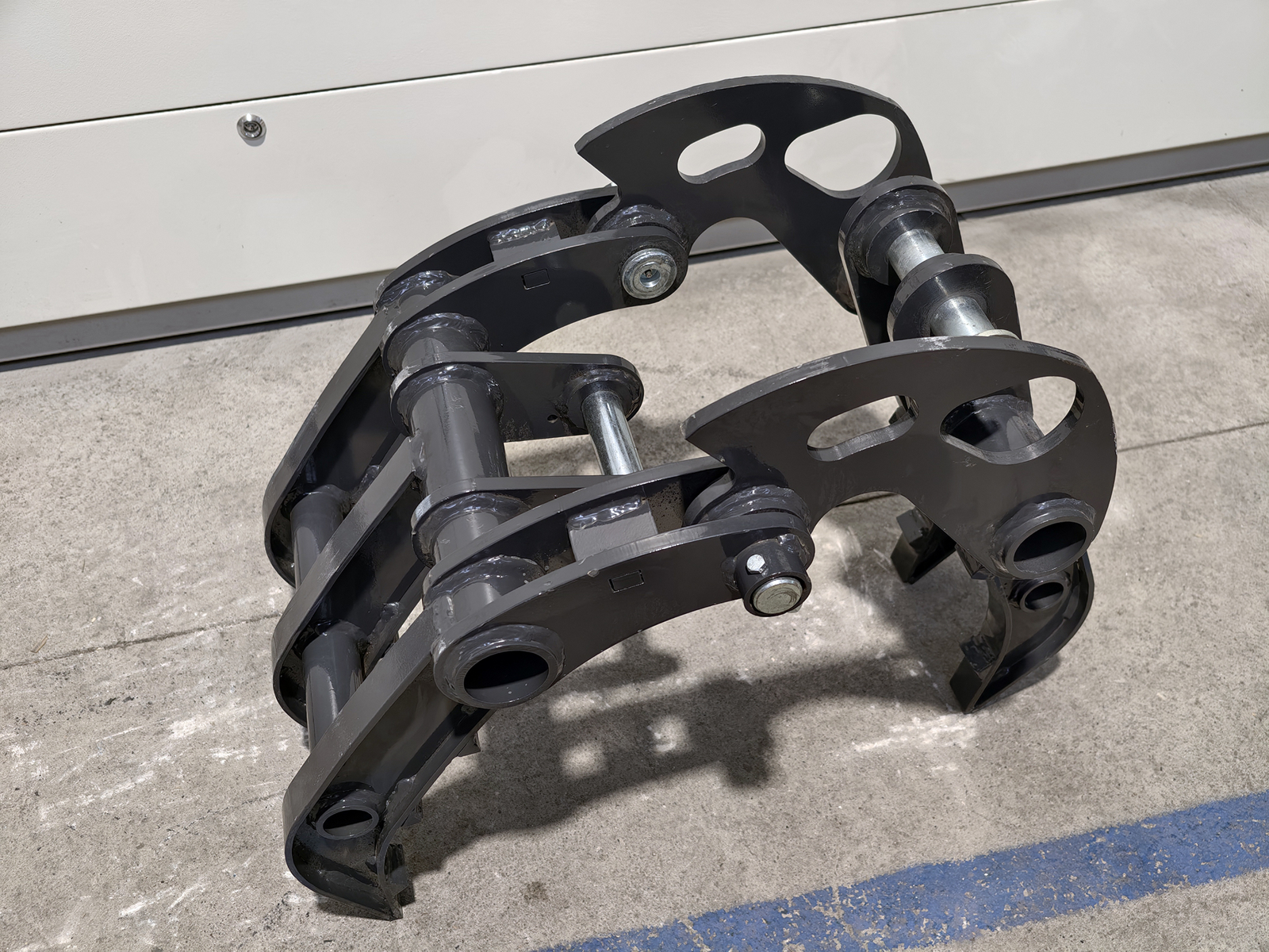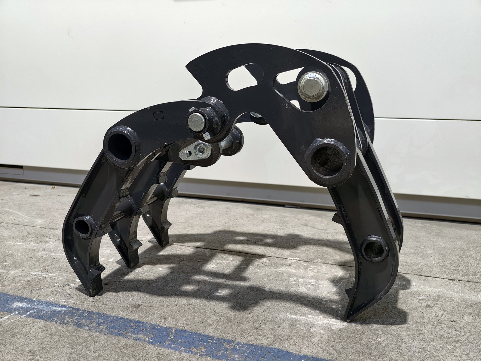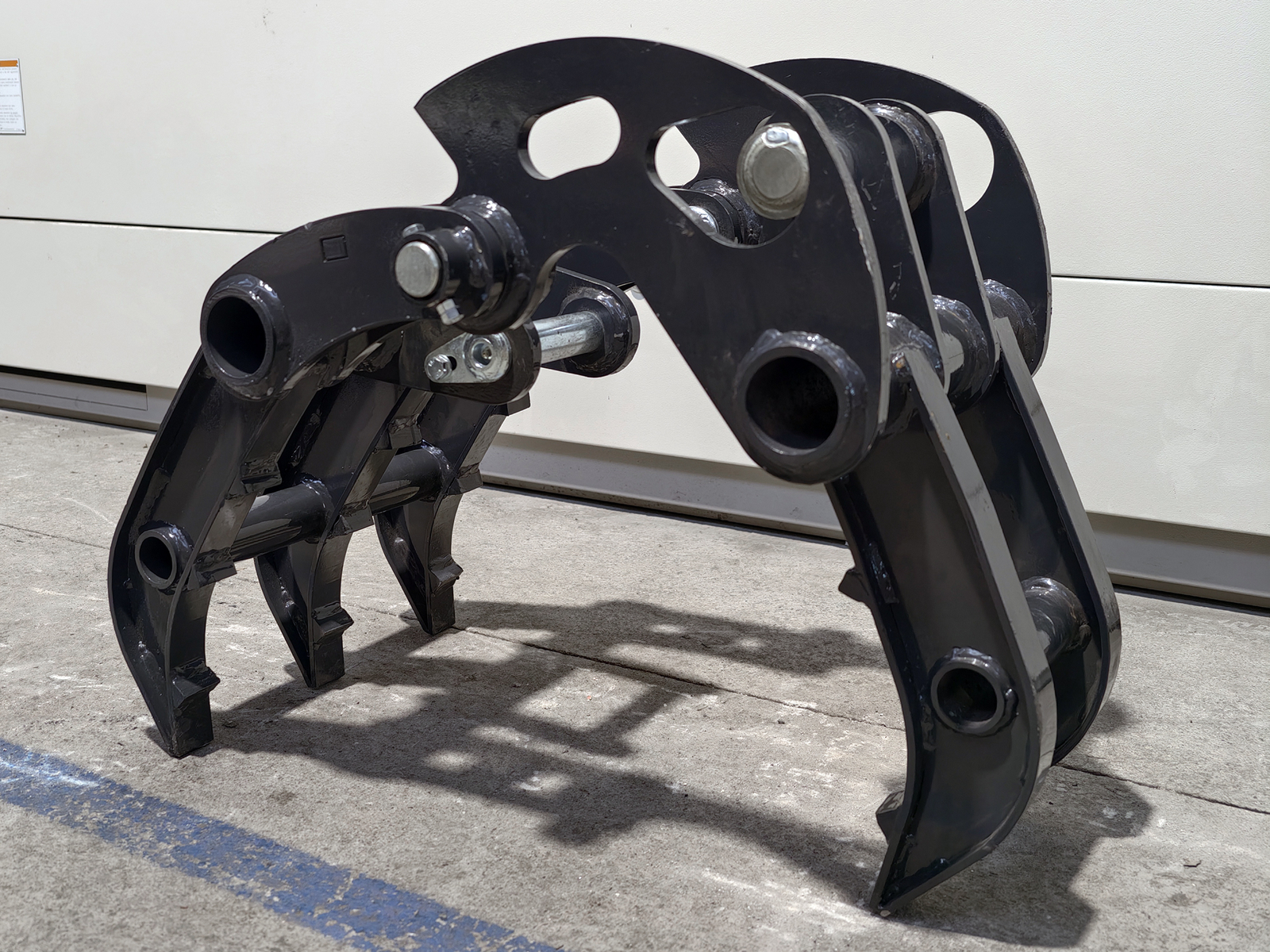 Greifer für S280-Minibagger, gefertigt aus hochfestem Baustahl, mit Einzelantrieb und profilierten Greifarmen für kompakte Materialien. Verbindung zum Löffelstiel über zwei Bolzen Ø35 mm mit Schmiernippeln oder über den mechanischen Schnellwechsler S280. Entwickelt für hohe Torsionssteifigkeit und Belastbarkeit beim Handling unregelmäßiger Lasten.