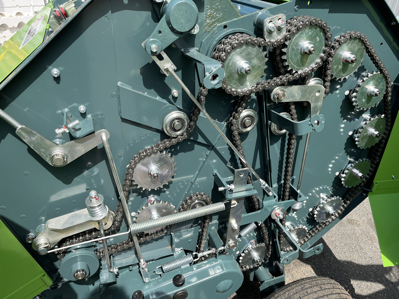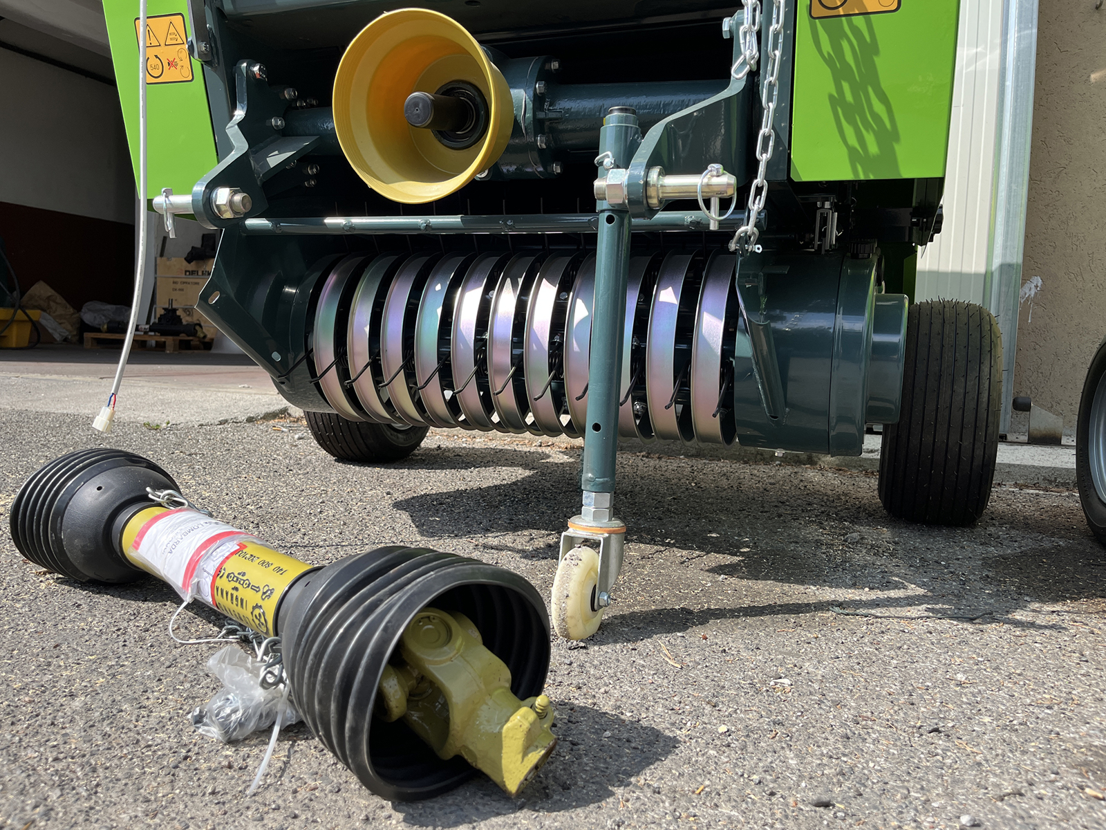 Diese Rundballenpresse kann an Traktoren angeschlossen werden - Zapfwellenbetrieb. Sie wird an der Heckdreipunktaufhängung des Traktors angebracht.