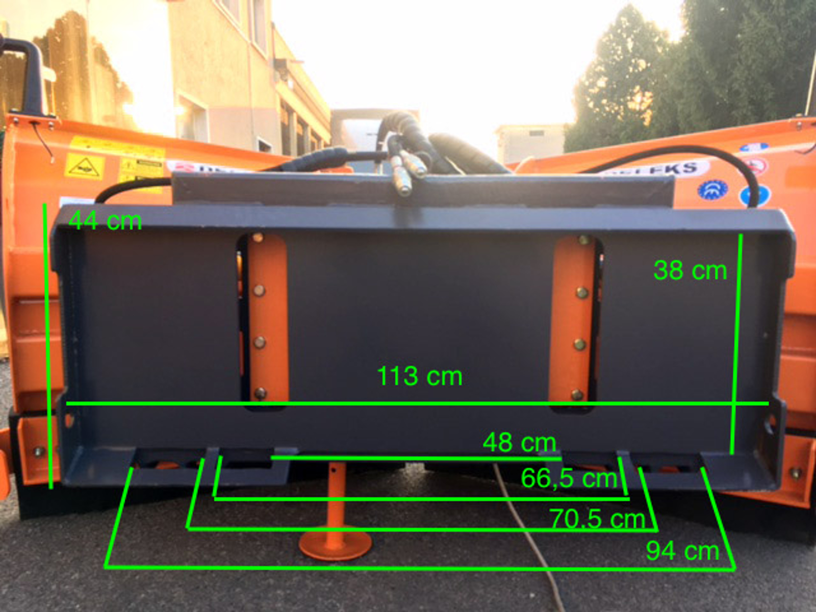 Angling of the plow is done hydraulically using two pistons, a 6-way solenoid valve and two hydraulic pipes (2.0m).