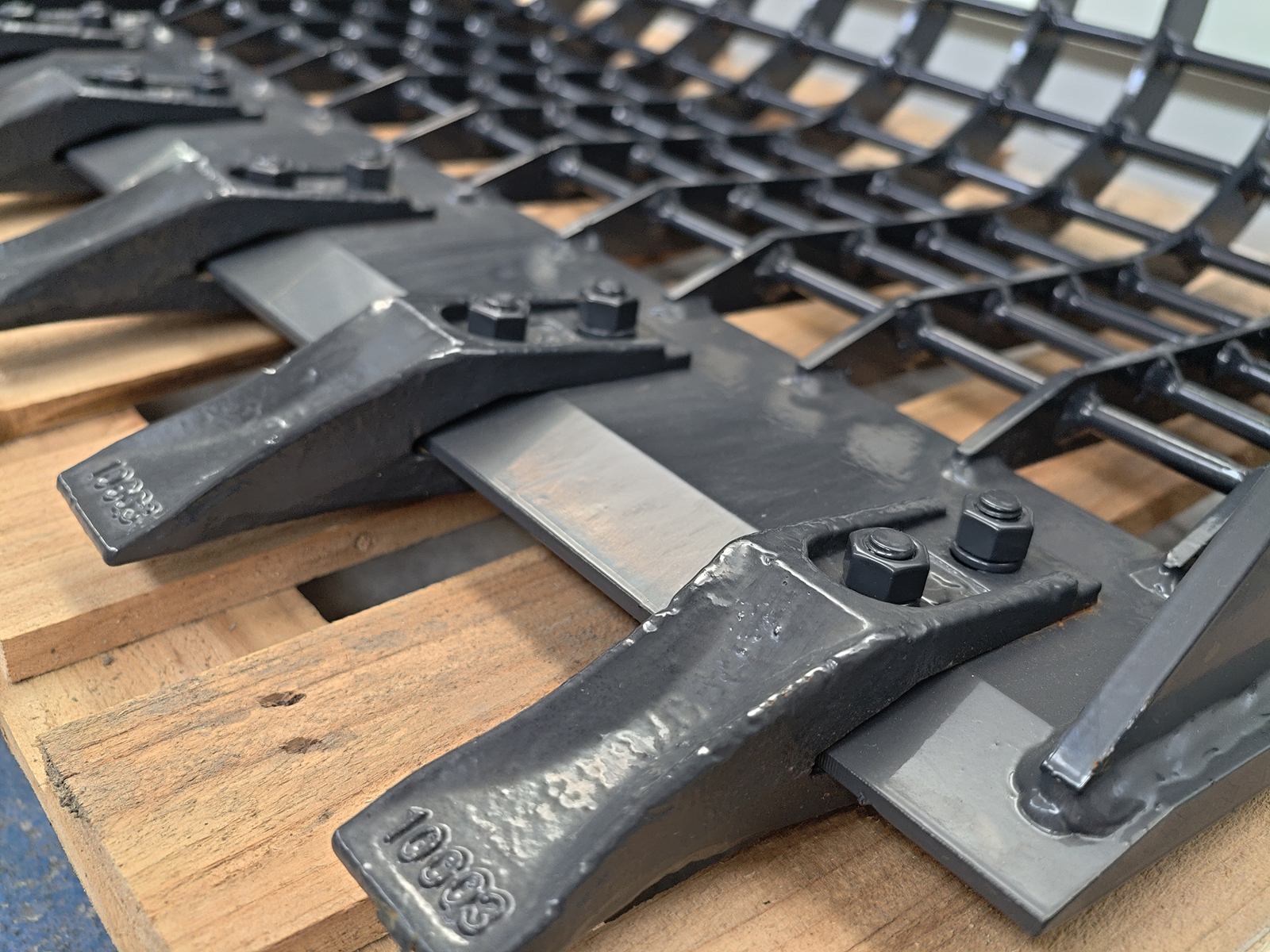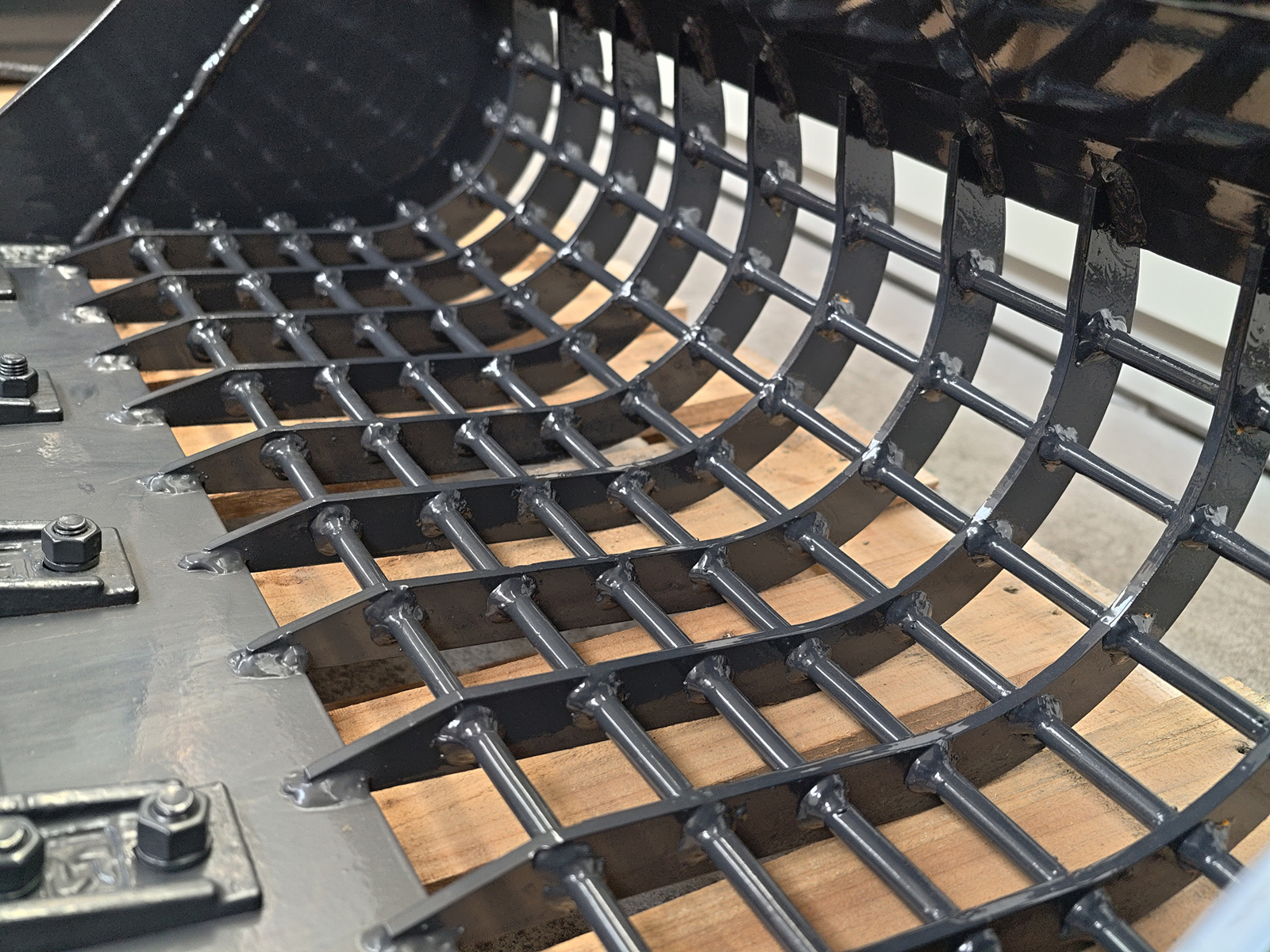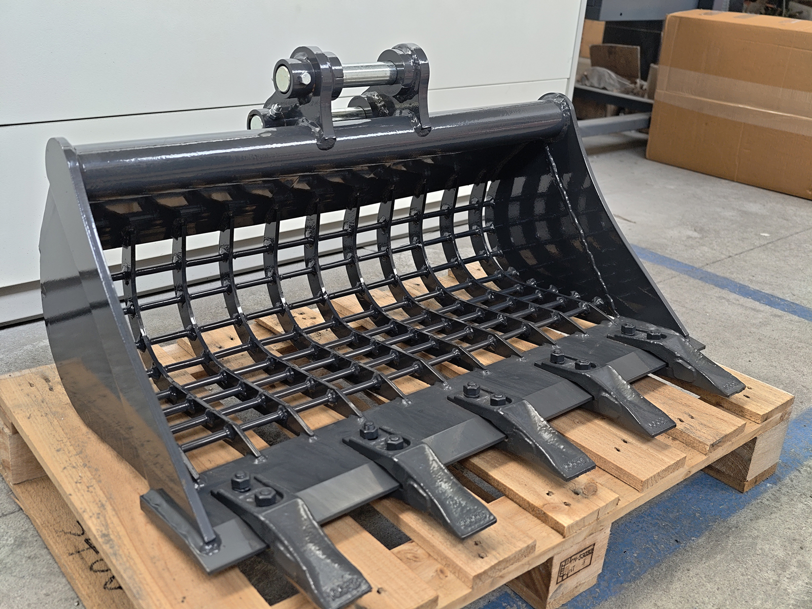 The open, reinforced grid structure with vertical tines provides high screening efficiency, ensuring fast separation of stones, bricks and coarse debris from fine soil. This reduces disposal of wet or contaminated material and enables reuse of the screened fractions.