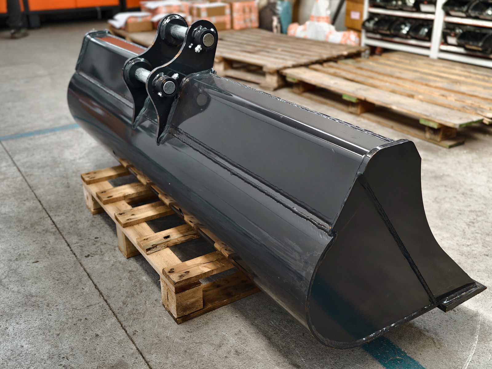 150 cm DELEKS® wide bucket for mini excavators with S280 attachment, supplied with 2 mounting pins.