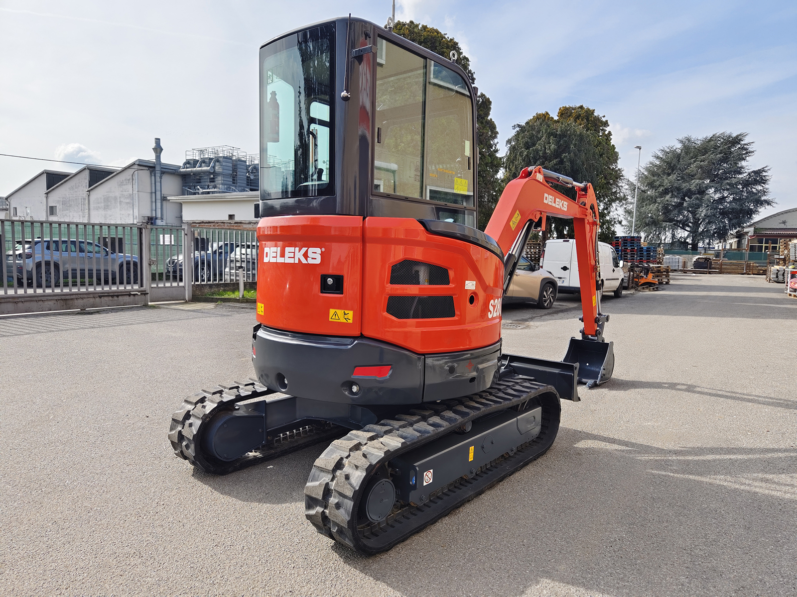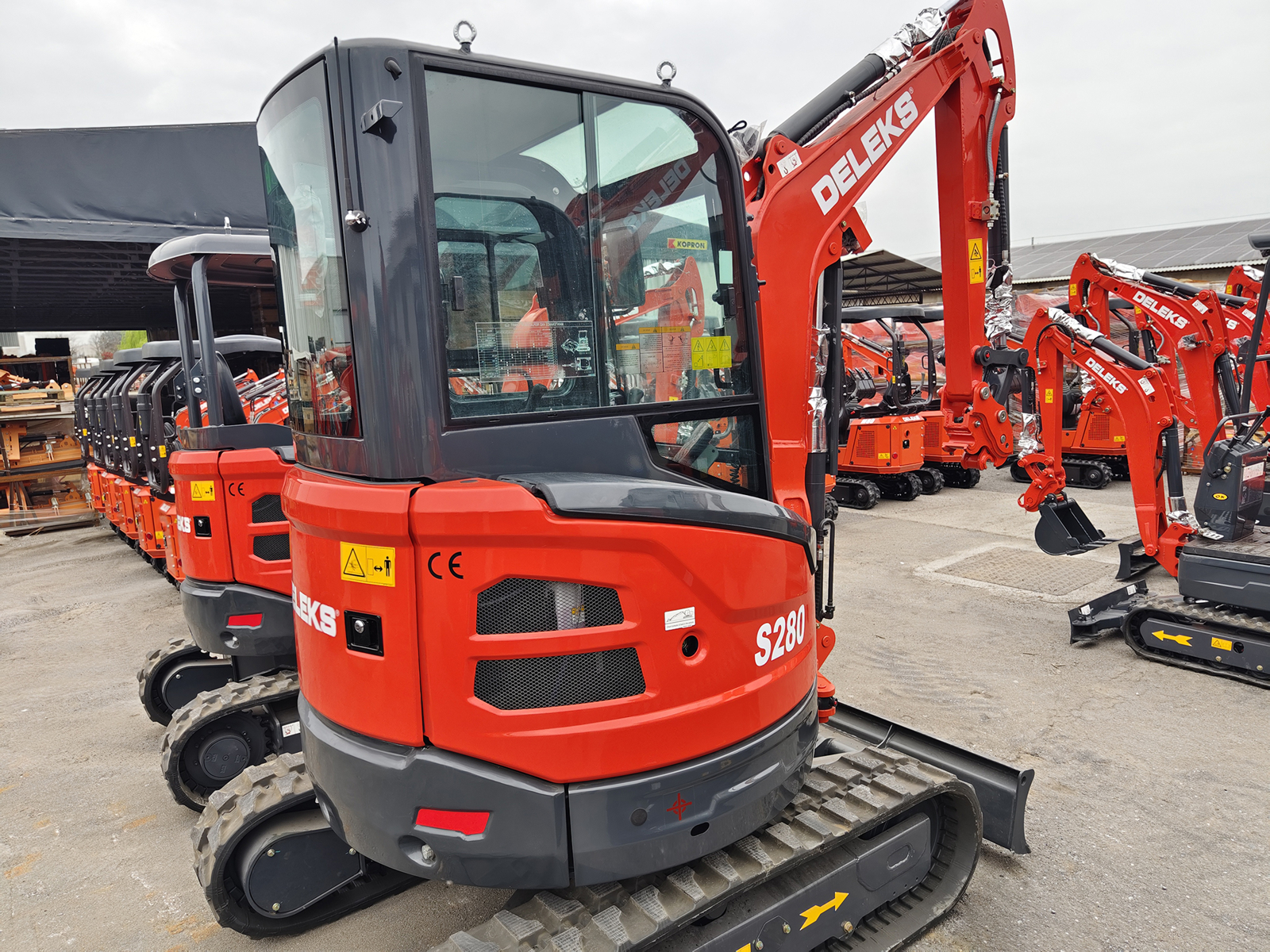 DELEKS® S280CK 2.8 t cab mini excavator, equipped with a Kubota D1105 Stage V 3-cylinder engine (1123 cc), heated cab, offset boom and dual travel speed up to 4 km/h.