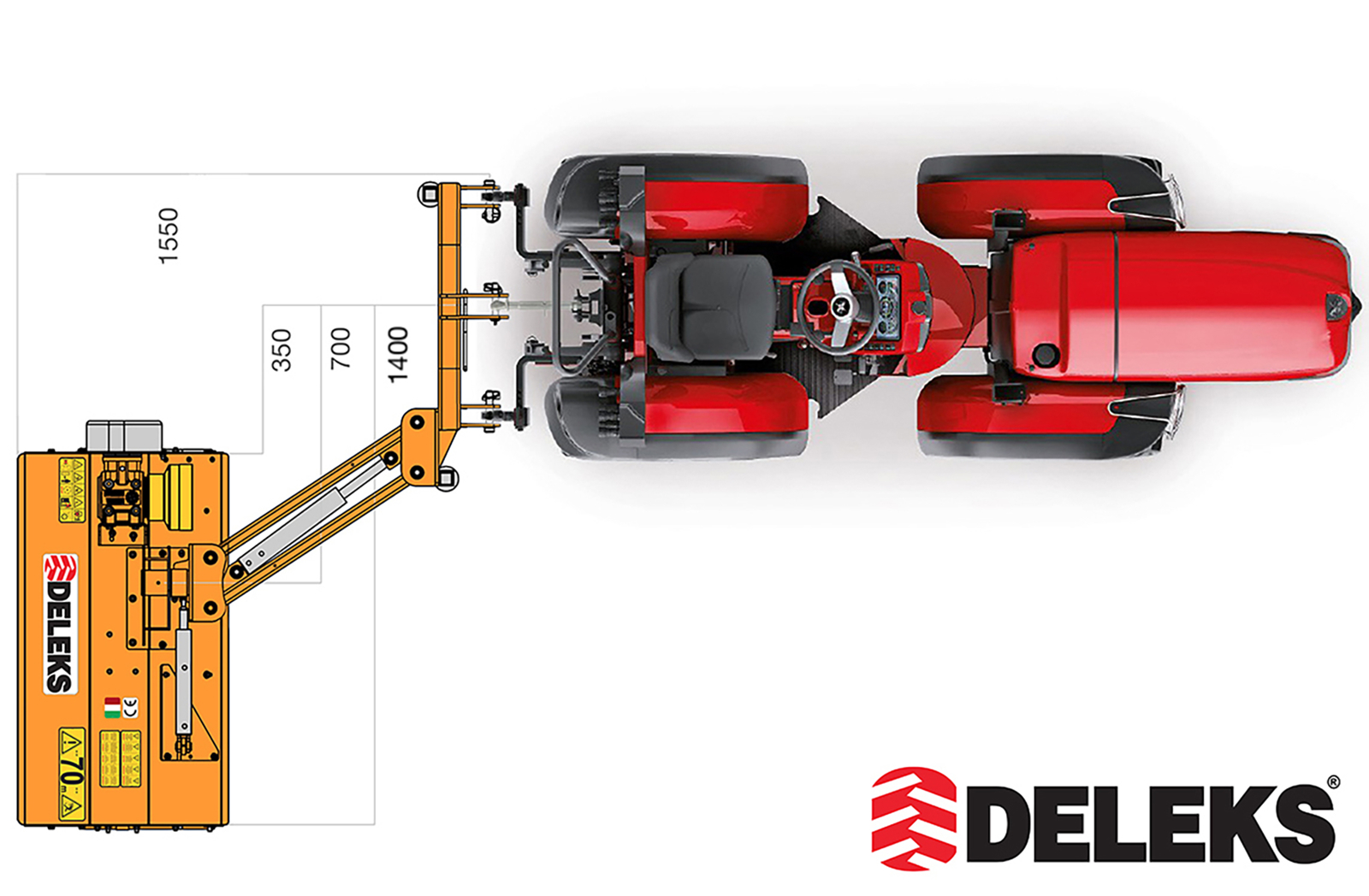This mower can be hydraulic offset to the side and also angled for access to hard to reach areas. This requires 2 double acting spools on the tractor for the 4 hoses which then operate the left-right movement & the up-down tilt of the cutting head. This flail is ideal for cutting small twigs and branches (2-3cm) up to and around trees when used horizontally.
