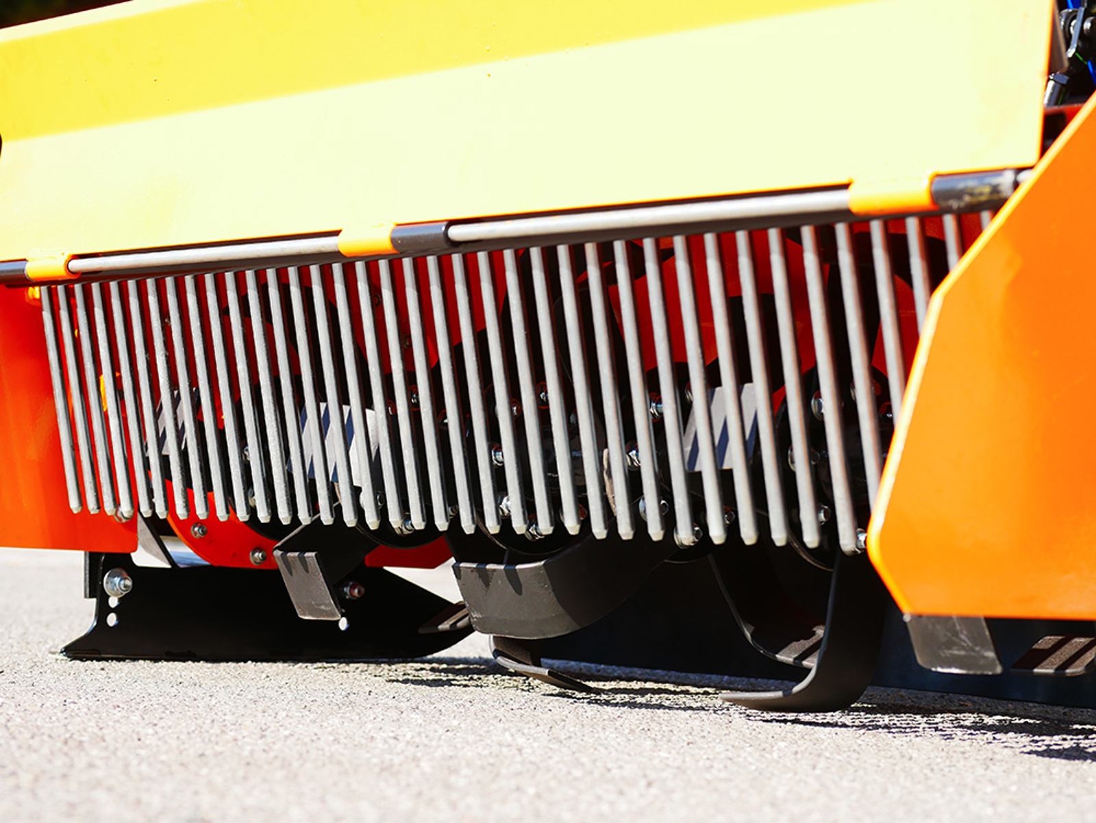 In der Höhe verstellbare Gleitkufen, welches die Fräse einige Millimeter vom Boden entfernt platziert und so ein vollständiges Umdrehen der Einstreu ermöglicht.