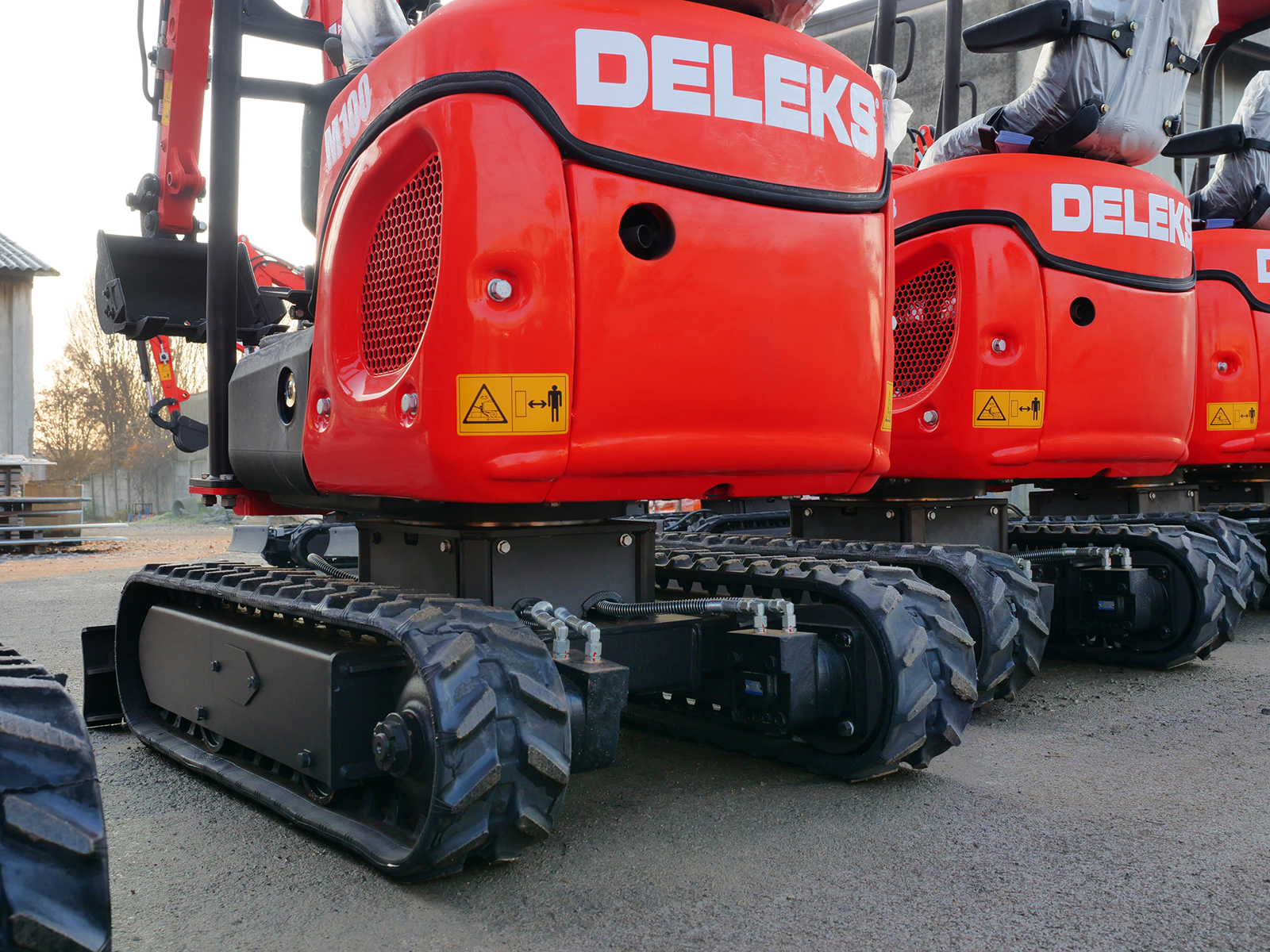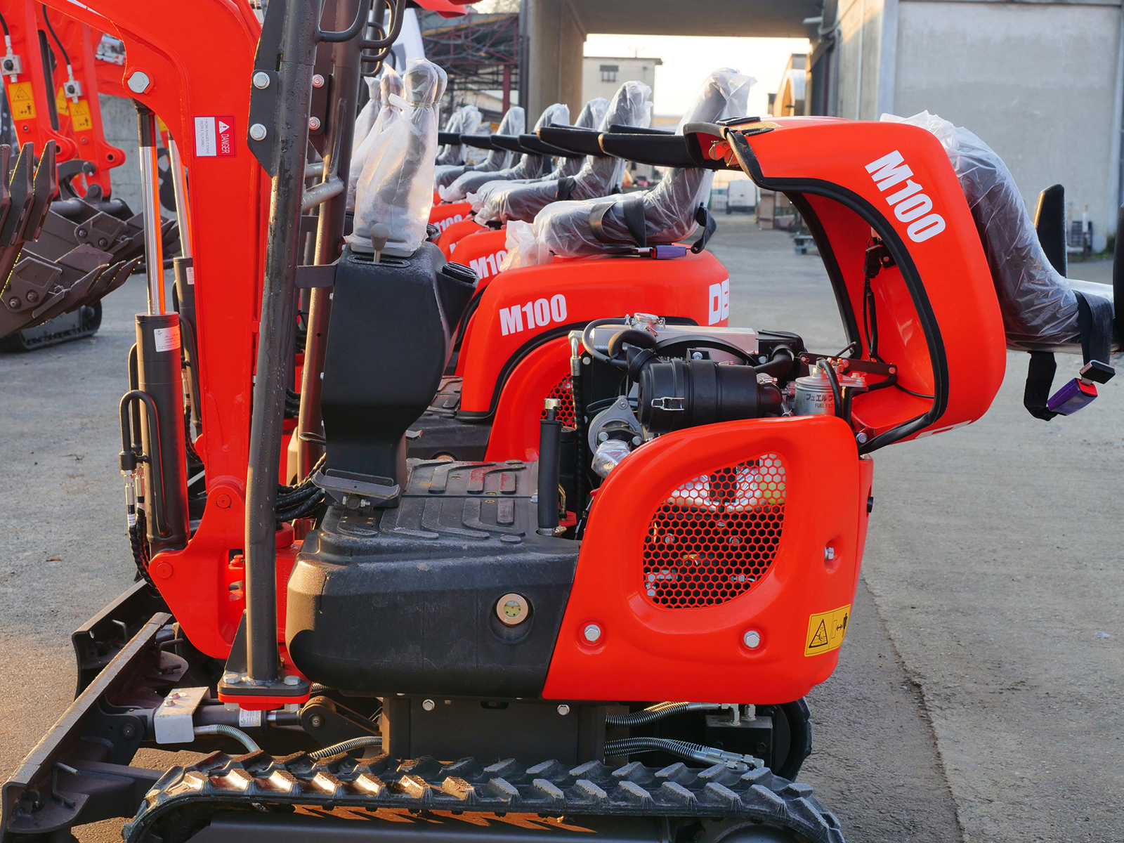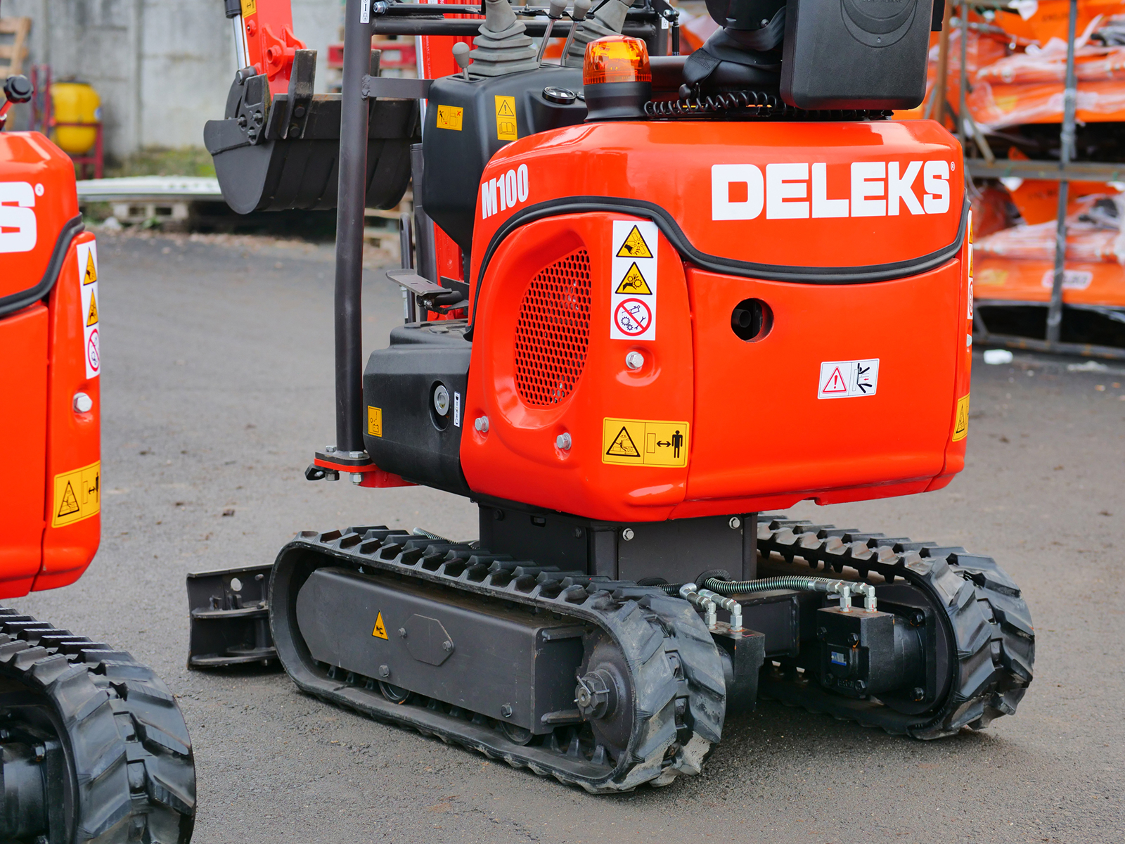 SCHLIESSENDer kompakte Minibagger DELEKS® M100 (1 Tonne) ist mit einem 3-Zylinder-Dieselmotor Kubota D722, einem ausziehbaren Fahrwerk und einem schwenkbaren Ausleger ausgestattet.