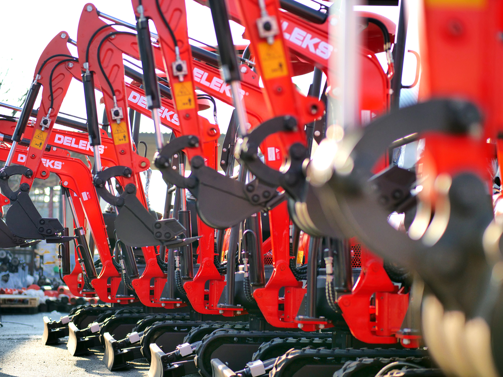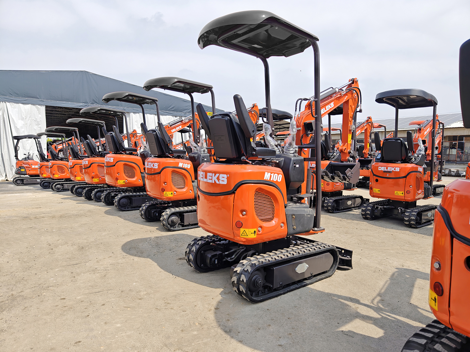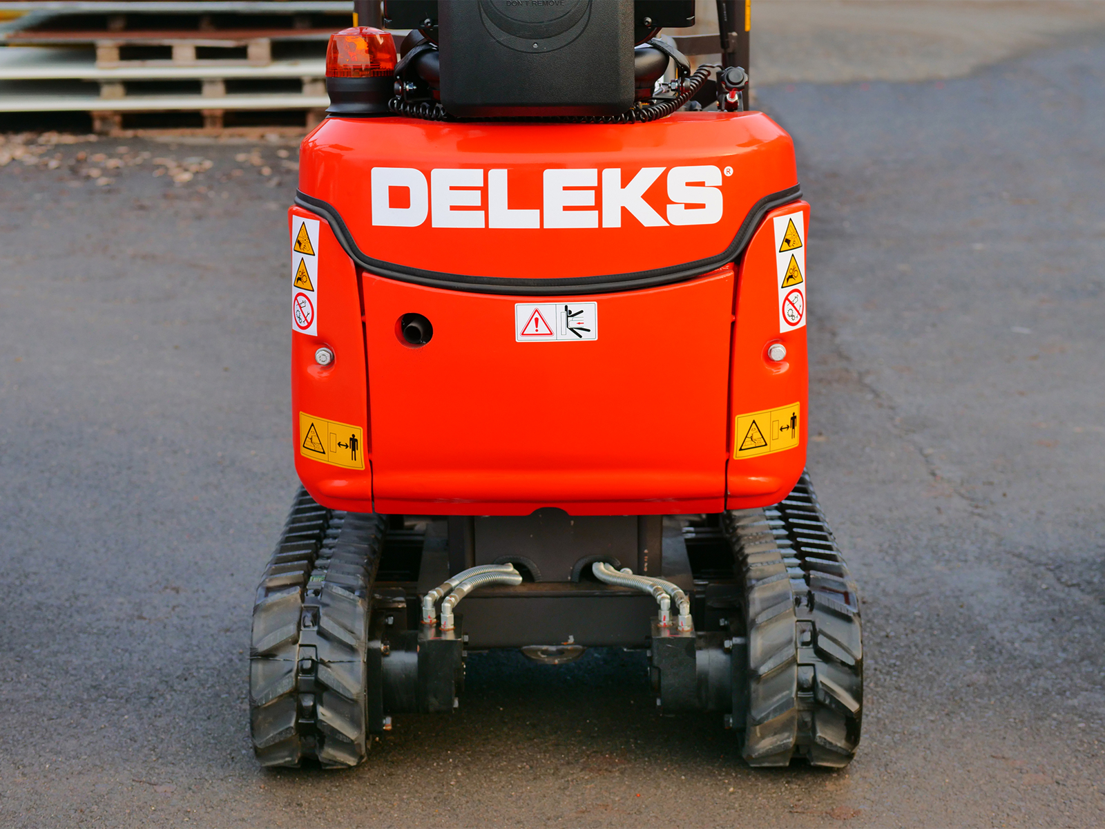 SCHLIESSENDer kompakte Minibagger DELEKS® M100 (1 Tonne) ist mit einem 3-Zylinder-Dieselmotor Kubota D722, einem ausziehbaren Fahrwerk und einem schwenkbaren Ausleger ausgestattet.