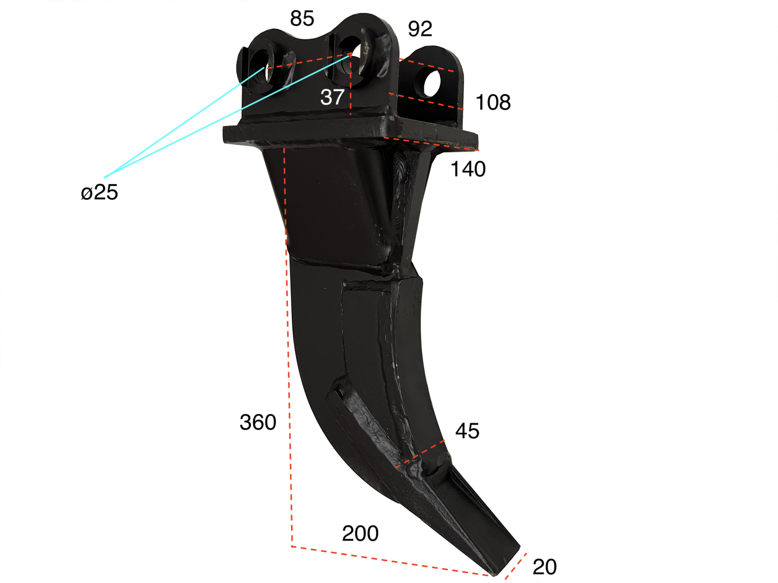 Die Konstruktion besteht aus hochfestem Stahl, mit verstärkten Platten im Aufnahmebereich und entlang des Zahns, was maximale Steifigkeit und lange Lebensdauer auch unter schweren Arbeitsbedingungen gewährleistet.