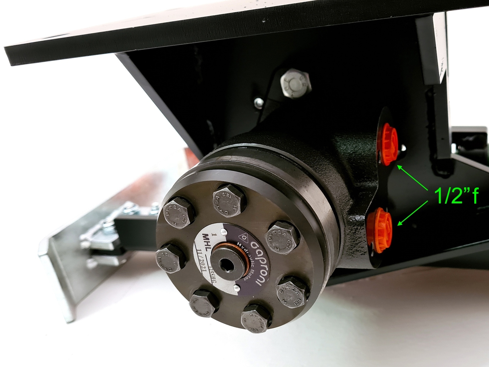 The set-up includes the hydraulic motor and the mounting plate with 4 mounting holes (measures shown in the images).